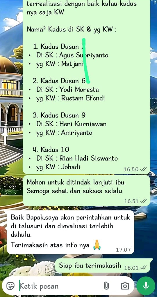 Lampung,RNN – Beredar pesan WhatsApp di beberapa group WhatsApp yang menyebutkan bahwa beberapa Aparatur Kampung kW , atau Palsu dimana dimaksud sebagai penerima SK tidak sesuai dengan kegiatan di lapangan, dengan kata lain orang yang bertindak sebagai Kepala Dusun berbeda dengan nama SK yang tercantum, Selasa (2/9/2025).