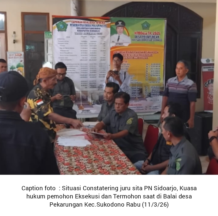Sidoarjo | RNN – Proses constatering (pencocokan objek eksekusi) perkara perdata di Desa Pekarungan, Kecamatan Sukodono, Kabupaten Sidoarjo,yang dilakukan tim juru sita Pengadilan Negeri Sidoarjo belum dapat dilaksanakan. Hal tersebut terjadi setelah pihak termohon eksekusi, Suryanto, menyatakan keberatan saat kegiatan yang melibatkan kuasa hukum ahli waris almarhum Zakariyah dan pihak pengadilan berlangsung di Balai Desa Pekarungan, Rabu (11/3/2026).