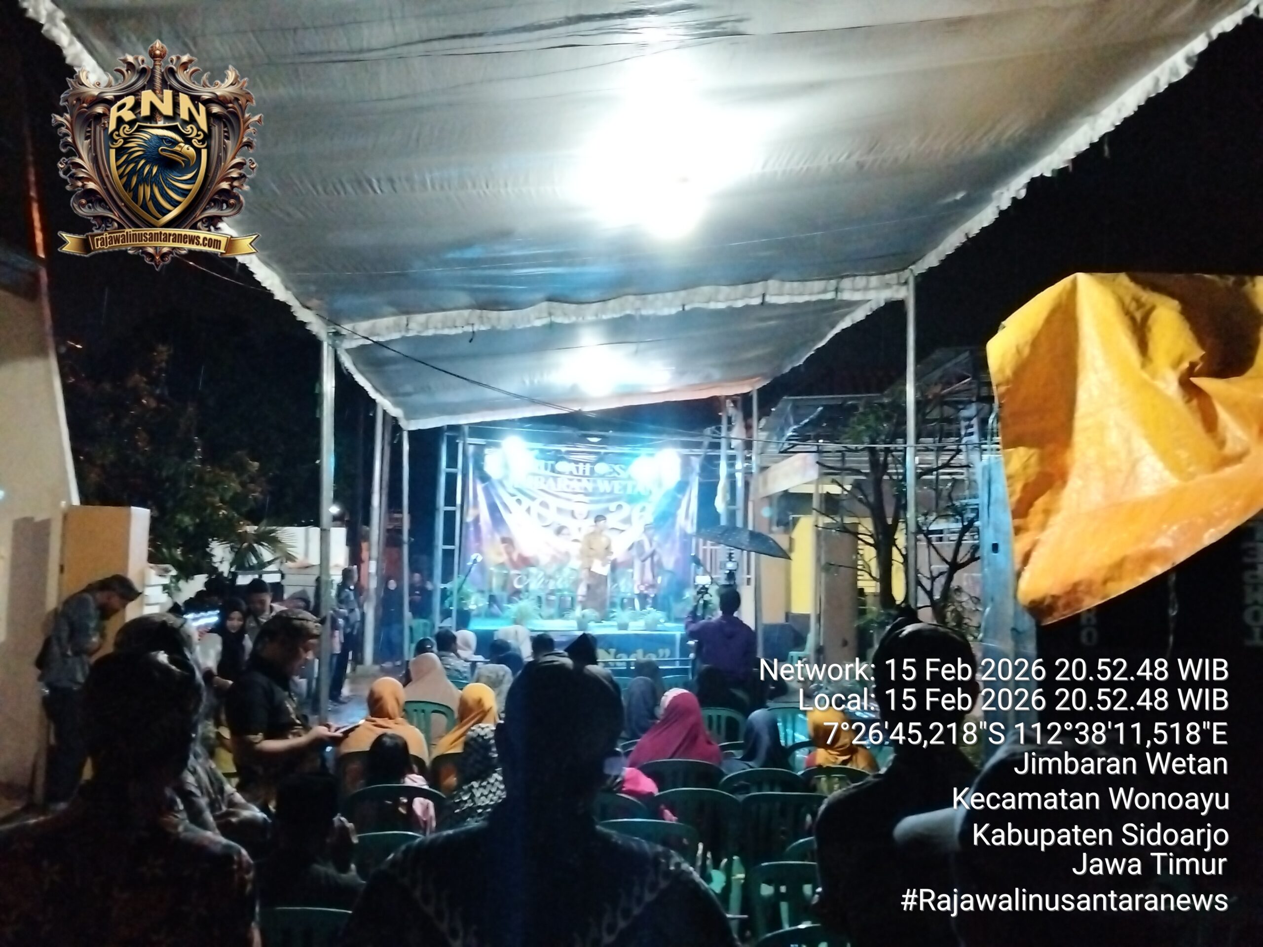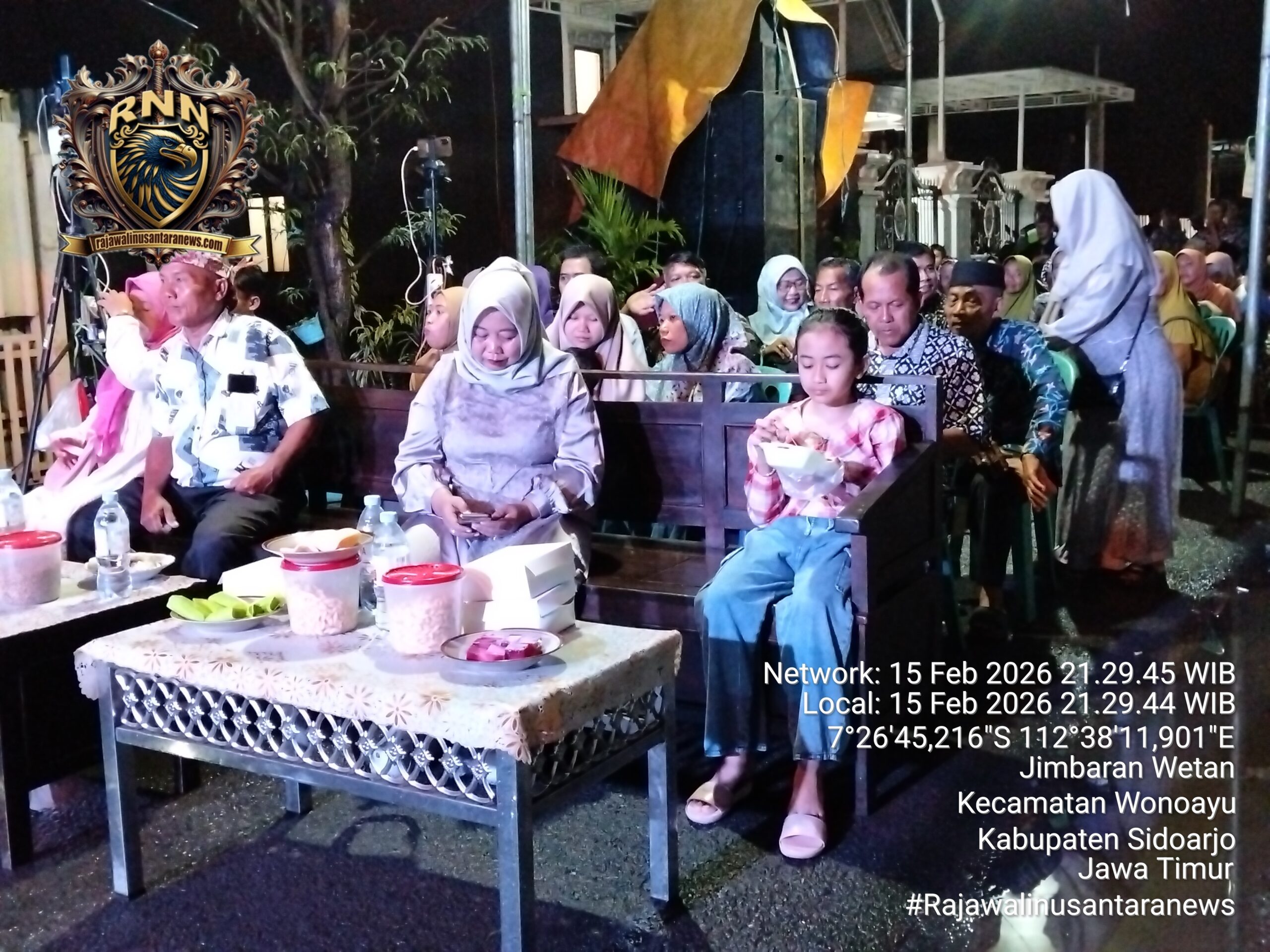 Sidoarjo | RNN – Warga desa Jimbaran Wetan, Kecamatan Wonoayu, melaksanakan ruwah desa sebagai tradisi tahunan yang diperingati pada hari Minggu, (15/2/26) malam di depan rumah ketua RW. 01 Sugeng Purnama dimeriahkan dengan hiburan Campursari. Kegiatan tersebut, sekaligus sebagai manifestasi rasa syukur kepada Tuhan, penghormatan kepada leluhur, sekaligus menjadi tolak bala. Adanya kegiatan ini masyarakat antusias berbondong-bondong melihat rangkaian acara tersebut. Tampak hadir dalam acara berbagai unsur desa. Di antaranya Kepala desa Jimbaran Wetan, BPD, LPMD, RT, RW, TP PKK, BUMDes, serta partisipasi aktif masyarakat Desa Jimbaran Wetan.
