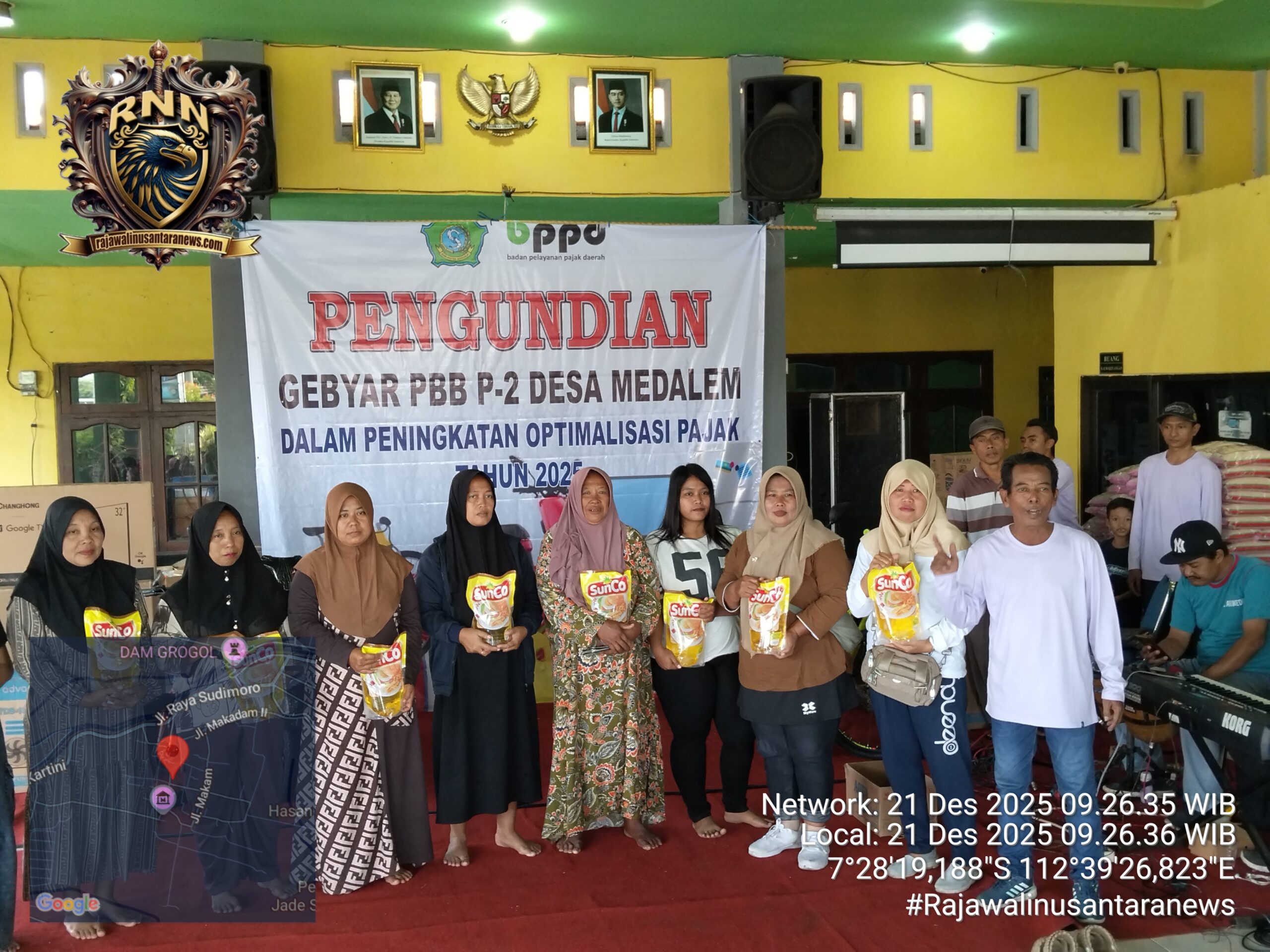 Sidoarjo | RNN – Pemerintah Desa Medalem Kecamatan Tulangan, Kabupaten Sidoarjo memberikan apresiasi bagi wajib pajak yang membayar pajak dengan taat. Apresiasi diberikan pada acara Gebyar PBB P-2 Untuk meningkatkan optimalisasi Pajak Daerah 2025, sebagai penyemangat kepada warga Desa medalem, dengan Kategori Lunas PBB-P2.