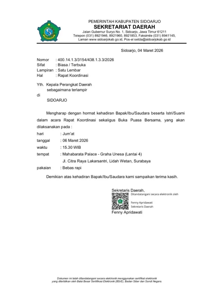 Sidoarjo | RNN – Adanya Gelaran Rapat Koordinasi sekaligus Buka Puasa Bersama yang dihelat Pemerintah Kabupaten (Pemkab) Sidoarjo pada Jumat (6/3/2026) sore, menuai gelombang protes dari masyarakat. Acara yang berlangsung di Mahabarata Palace, Lantai 4 Graha Unesa, Surabaya tersebut dianggap tidak empati terhadap kondisi daerah yang tengah dikepung persoalan infrastruktur.