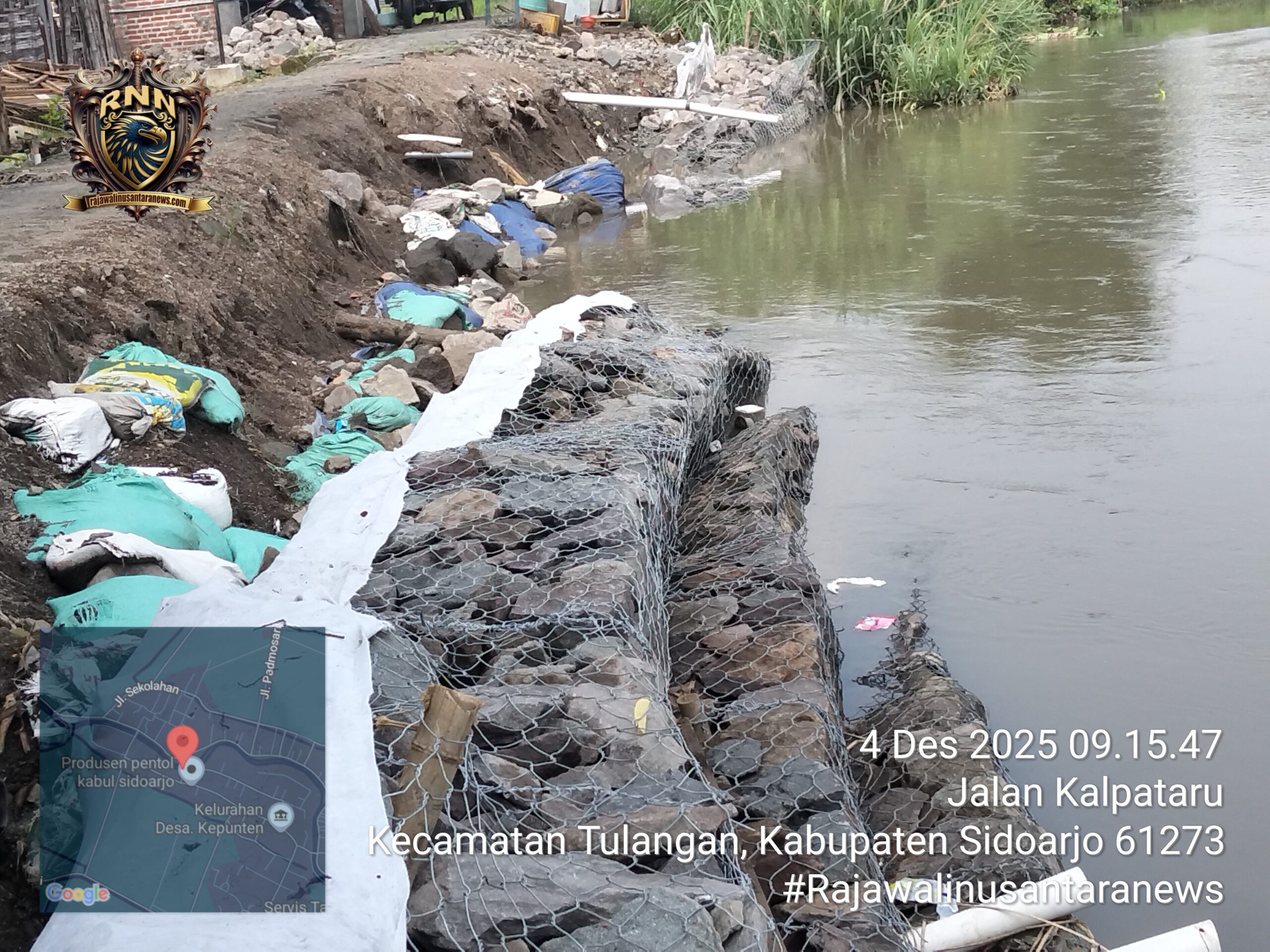 Sidoarjo – RNN Belum satu bulan selesai dikerjakan, proyek tanggul bronjong sepanjang 30 Meter di sungai Desa Kepunten, Kecamatan Tulangan, Kabupaten Sidoarjo sudah mengalami kerusakan dan ambrol sampai 2 kali dan papan informasi proyek dicabut. Warga setempat, sebut saja sitampan (nama samaran) menyampaikan bahwa sebelumnya terlihat ada pekerjaan tanggul pemasangan bronjong yang dikerjakan oleh dinas pengairan Kabupaten Sidoarjo menghabiskan anggaran 175 Juta.