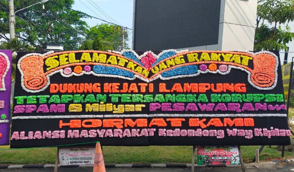 Bandar Lampung — Sejumlah karangan bunga berjejer rapi di halaman Kantor Kejaksaan Tinggi (Kejati) Lampung, Jumat (17/10/2025). Karangan bunga tersebut berisi pesan dukungan kepada Kejati Lampung atas penanganan dugaan korupsi proyek Sistem Penyediaan Air Minum (SPAM) di Kabupaten Pesawaran yang bernilai sekitar Rp8 miliar.