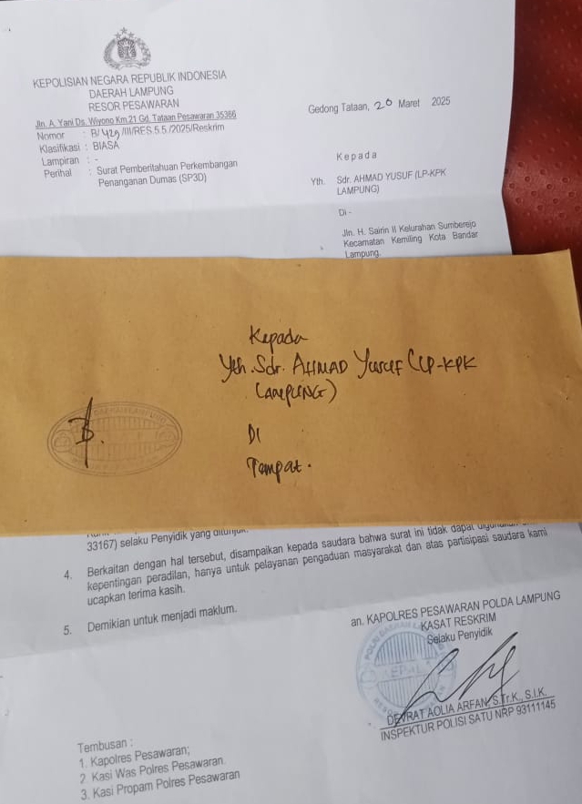 Saya tegaskan lagi atas laporan kami dari lembaga LP-KPK , Aparat Penegak Hukum Polres Pesawaran jalankan sesuai peraturan Undang-undang yang berlaku di negara indonesia ini, dan saya sudah di panggil oleh pihak Polres Pesawaran,untuk diminta’i keterangan atas laporan saya terkait tambang emas ilegal milik Wawan Cs tersebut,