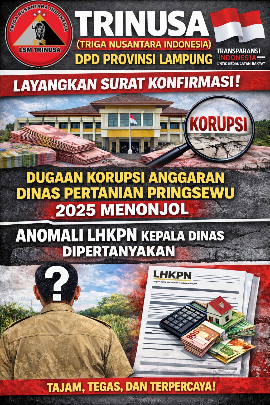 Lampung,RNN-25 Februari 2026 – Lembaga Swadaya Masyarakat (LSM) Trinusa DPD Provinsi Lampung secara resmi melayangkan surat konfirmasi kepada Pemerintah Kabupaten Pringsewu, khususnya Dinas Pertanian. Langkah ini buntut dari ditemukannya indikasi kuat penyelewengan dan potensi korupsi dalam realisasi Anggaran Pendapatan Belanja Daerah (APBD) Tahun Anggaran 2025.