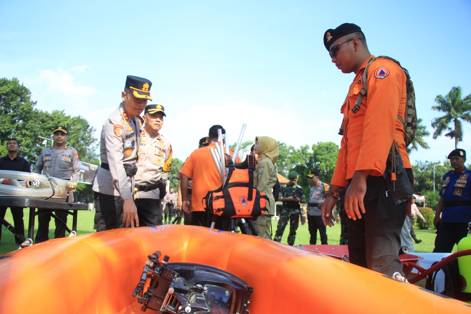 Setelah apel kesiap siagaan tanggap bencana di lanjutkan dengan pemeriksaan perlengkapan SAR dan kendaraan tanggap bencana oleh Kapolres di samping Forkopimda.