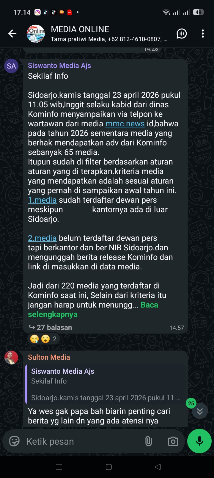 Adanya pemberitaan dari media Duta Masyarakat (Duta.co) Siswanto pada hari Kamis, (23/4/26) pukul 14.57 Wib. lewat Group Media Online yang disediakan oleh Diskominfo sebagai tempat komunikasi dengan wartawan di Sidoarjo memberitahukan hasil komunikasi wartawan mmc.id dengan Kepala Bidang Pengelolaan Informasi dan Komunikasi (Pikom) Anita Inggit Z.S.,S.STP.,M.A.P. lewat pesan Singkat WhatsApp dengan pada Kamis (23/4/26) pukul 11.05 Wib. Adapun isi komunikasi lewat telp ke wartawan media mmc.id dengan Kabid Pikom Sidoarjo Anita Inggit. Bahwa pada tahun 2026 sementara media yang berhak mendapatkan adv dari Kominfo sebanyak 65 media, Itupun sudah di filter berdasarkan aturan-aturan yang di terapkan sesuai kriteria media yang mendapatkan adalah sesuai aturan yang pernah di sampaikan awal tahun ini.” Kata Inggrit lewat telp ke wartawan mmc.id