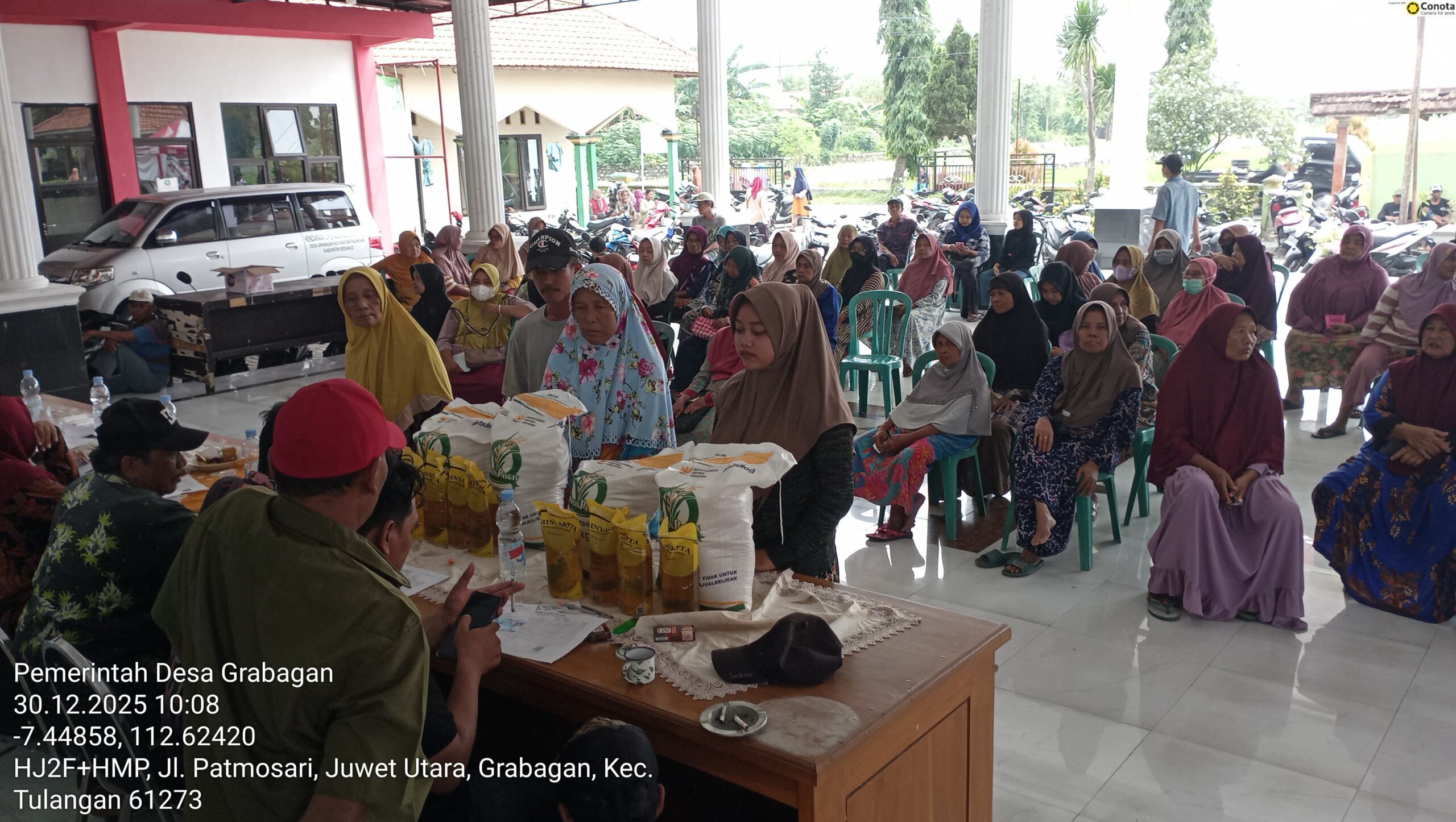 Sidoarjo | RNN – Pemerintah kembali menggelontorkan Bantuan pangan (banpang) yang menjadikan salah satu program pemerintah untuk bantalan ekonomi masyarakat, berkontribusi terhadap penurunan kemiskinan. Seperti yang dilakukan pemerintah desa Grabagan, sebanyak 362 warga mendapatkan bantuan berupa 20 Kg Beras dan 4 Liter Minyak Goreng di balai desa Grabagan Selasa (30/12/2025).