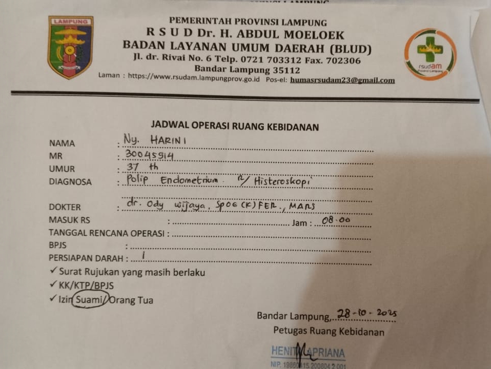Menurut Desy, Harini baru menyelesaikan konsultasi praoperasi pada 28 Oktober 2025 dan telah dijadwalkan menjalani tindakan pada 12 November 2025. Namun, operasi harus ditunda karena pasien sedang menstruasi.