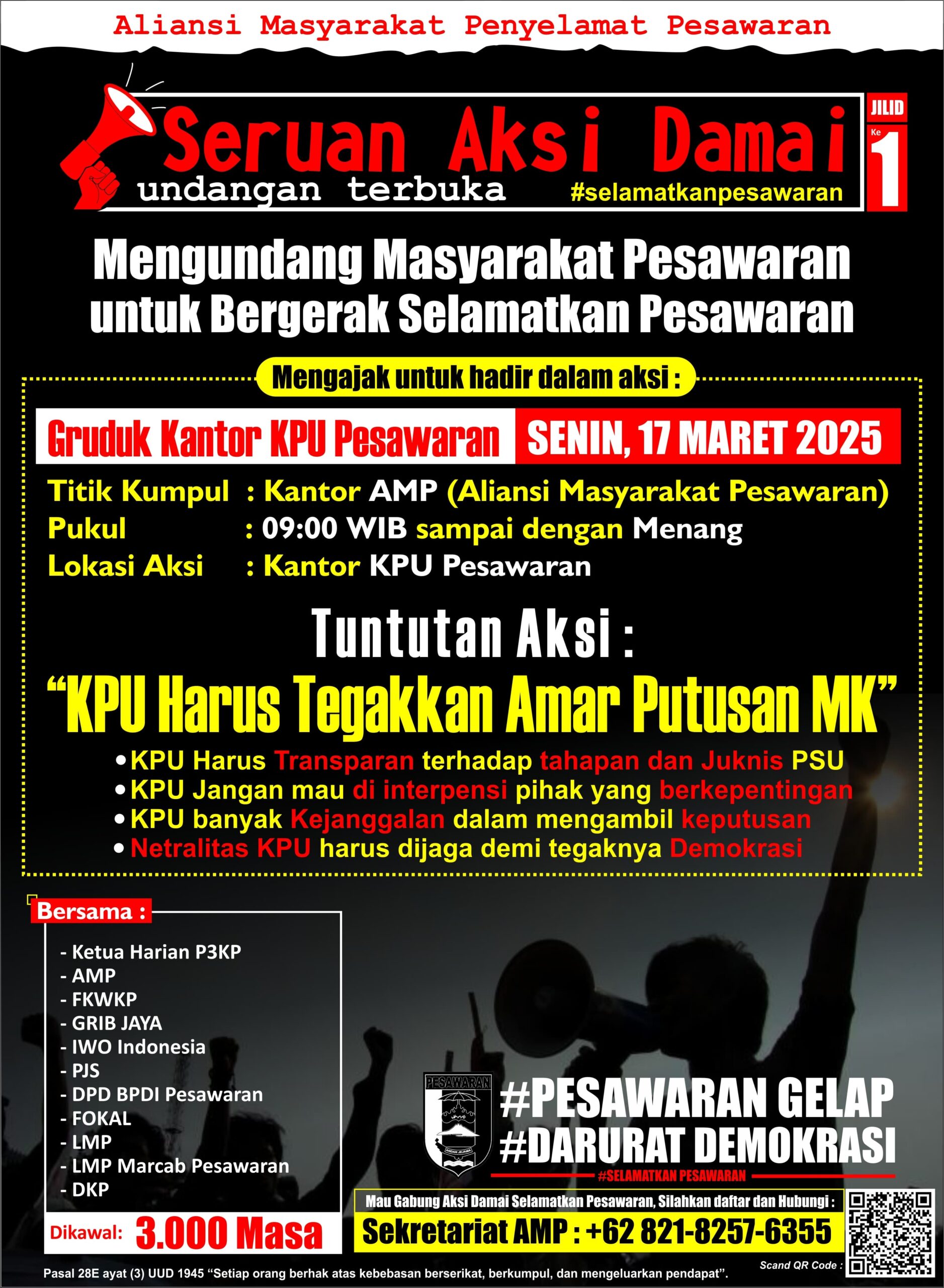 Dalam seruan tersebut, masyarakat diajak untuk bergabung dalam aksi damai yang akan digelar pada Senin, 17 Maret 2025, pukul 09:00 WIB, di Kantor KPU Kabupaten Pesawaran.