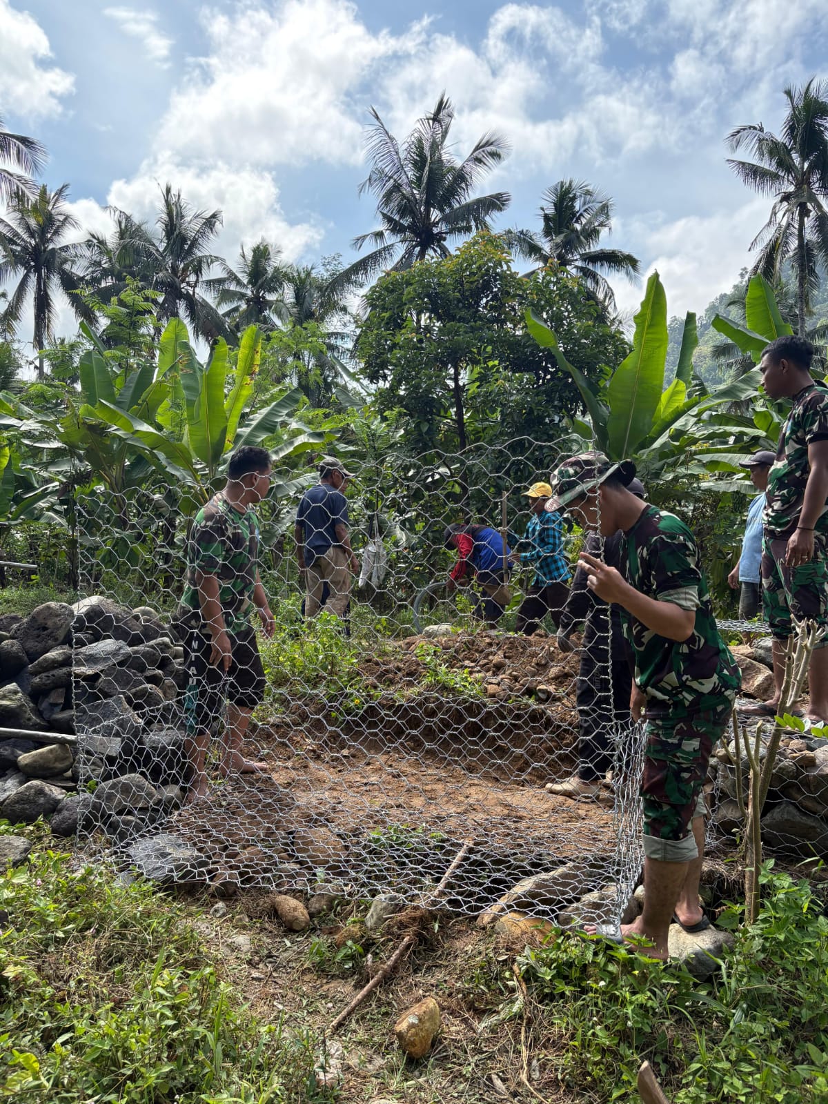 Pekerjaan ini melibatkan personel Satgas TMMD bersama warga setempat yang bahu membahu memasang bronjong di tepi sungai guna mencegah longsor dan erosi, terutama saat musim hujan tiba.