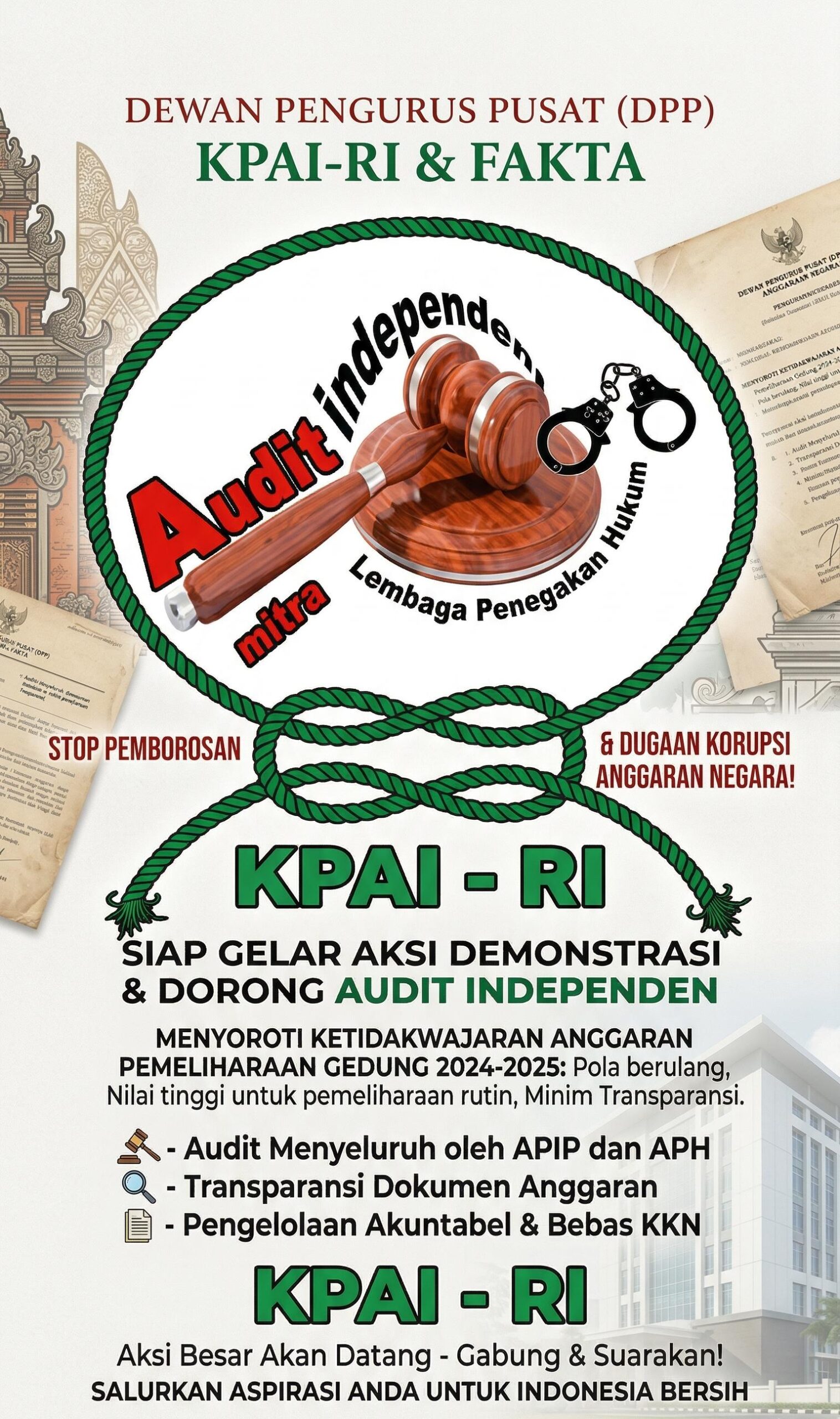 Bandar Lampung,RNN-Sejumlah kegiatan belanja pemeliharaan gedung Tahun Anggaran 2024 hingga 2025 menjadi sorotan Dewan Pengurus Pusat Konsorsium Pengawasan Audit Independen Republik Indonesia (DPP KPAI-RI) bersama Forum Analisis Kebijakan Transparansi Anggaran (FAKTA).