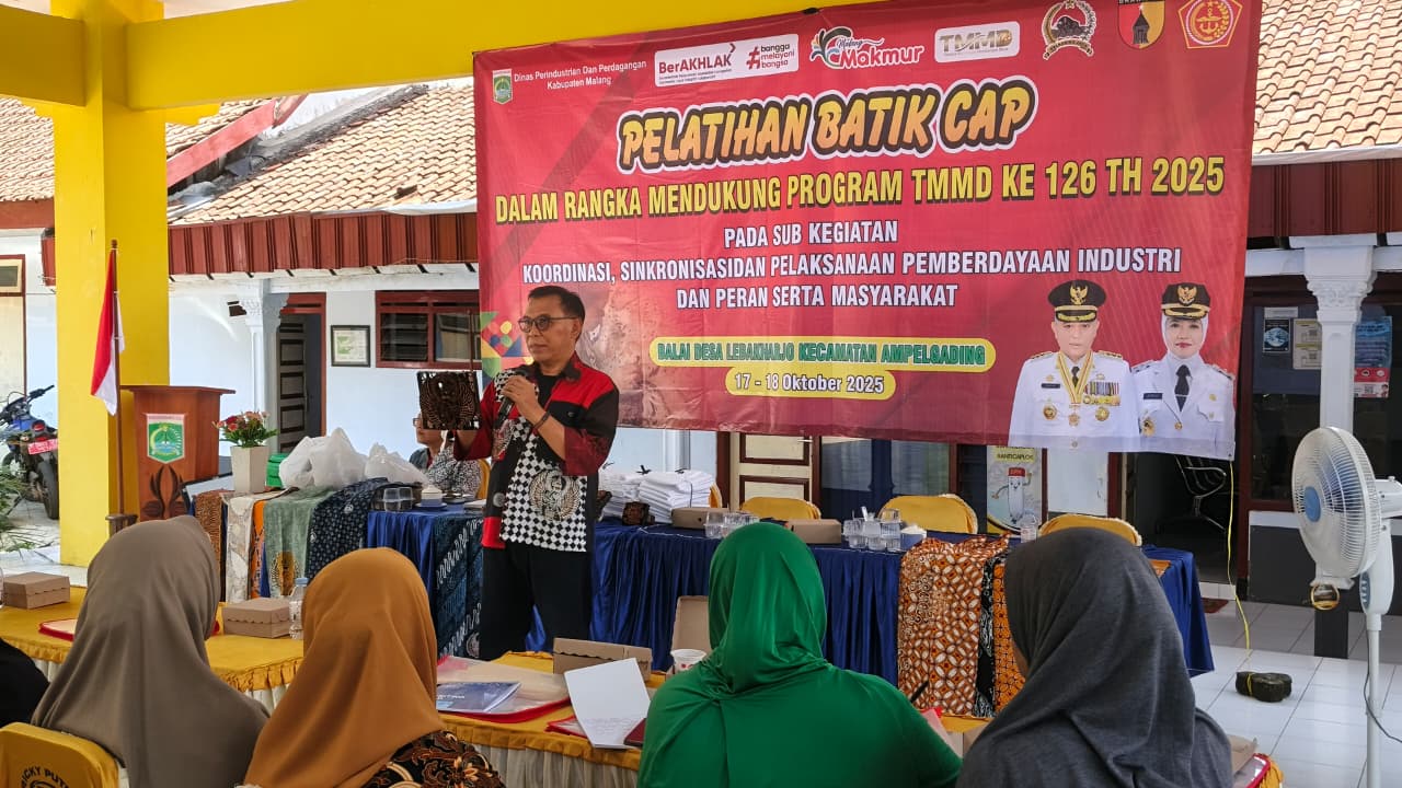 Malang, RNN — Program TNI Manunggal Membangun Desa (TMMD) ke-126 Kodim 0818/Malang-Batu tidak hanya berfokus pada pembangunan fisik, tetapi juga menyentuh pemberdayaan ekonomi masyarakat. Hal itu tampak dalam kegiatan Pelatihan Batik Cap yang digelar di Balai Desa Lebakharjo, Kecamatan Ampelgading, pada Jumat (17/10/2025).